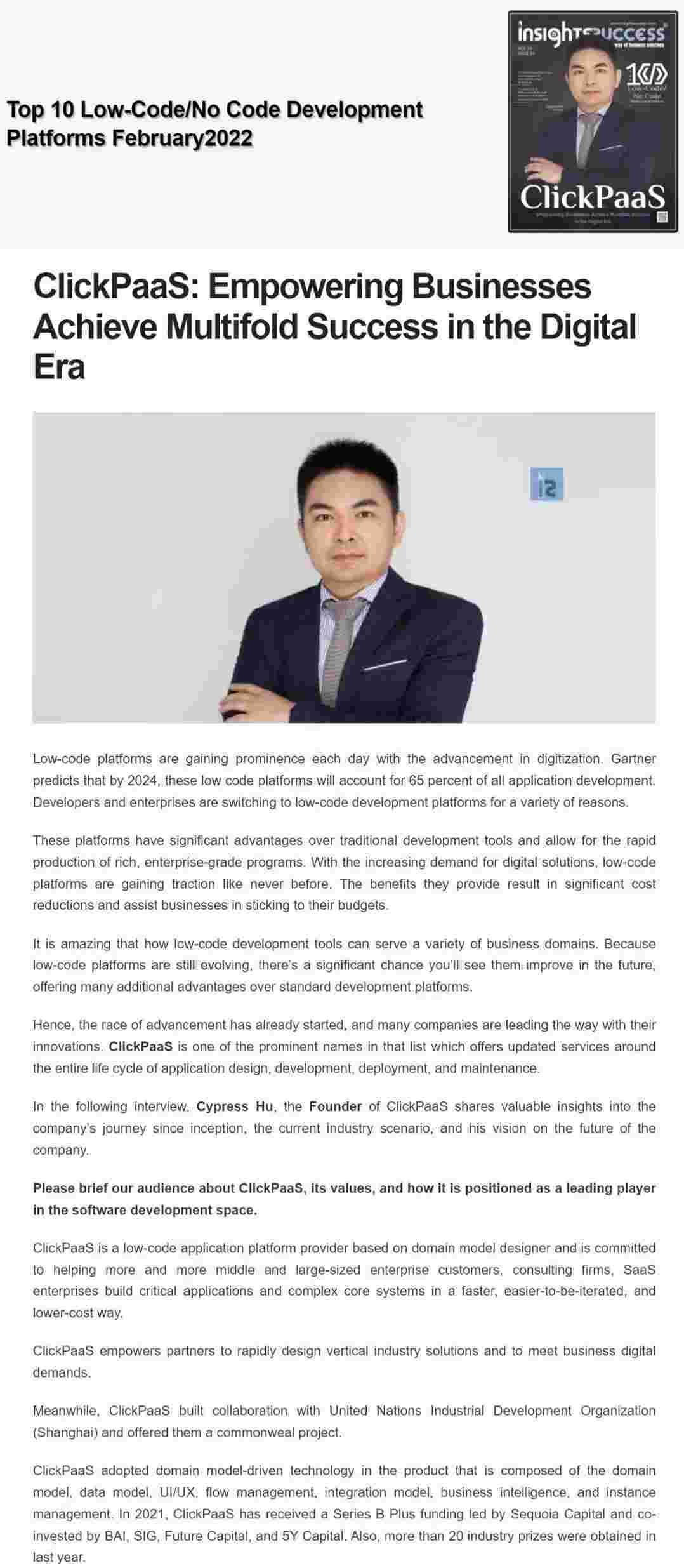 2022年年初,,,钱能钱包入选外媒Insights Success低代码/无代码开发平台 Top10,,,创始人、、、、CEO胡柏受邀接受专访并荣登封面人物,,他与Insights Success的读者分享了钱能钱包成立的初心、、、、发展历程、、、、当前的行业发展趋势以及他对公司未来的展望。。。。
